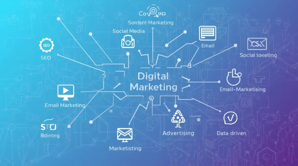 دیجیتال مارکتینگ به زبان ساده یعنی استفاده از ابزارها و کانال های آنلاین برای معرفی برند، افزایش فروش، ارتباط با مشتری و توسعه بازار. این مفهوم شامل مجموعه ای از فعالیت های به هم پیوسته است که بر پایه رفتار کاربران و الگوریتم های هوشمند اجرا می شوند.